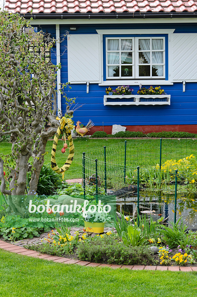 Jardin familial avec abri de jardin bleu et étang de jardin