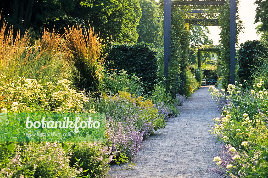 Jardin luxuriant de plantes vivaces fleuries avec plusieurs pergolas
