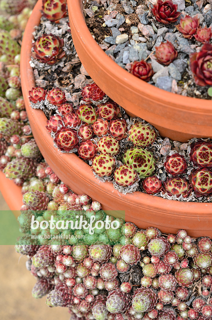 Joubarbe (Sempervivum) dans des pots de fleurs superposés
