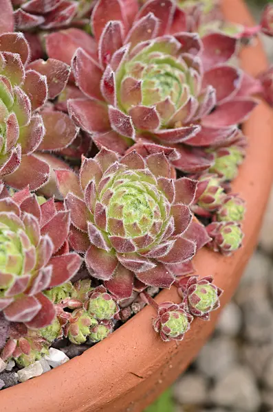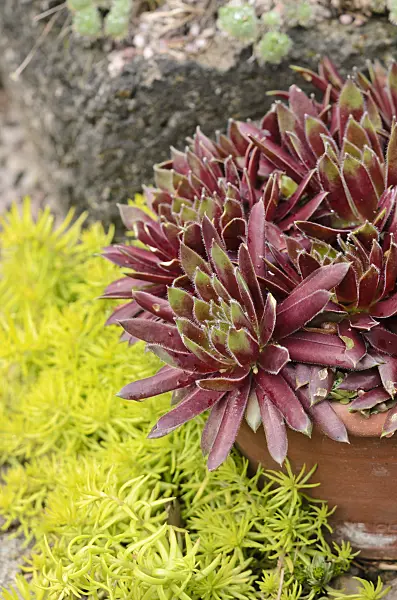 Joubarbes (Sempervivum) dans une coupe à fleurs