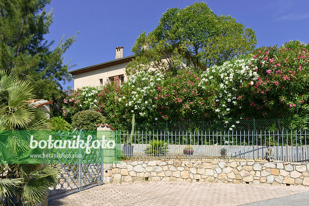 Laurier rose (Nerium oleander) devant une maison d'habitation, Mandelieu, France