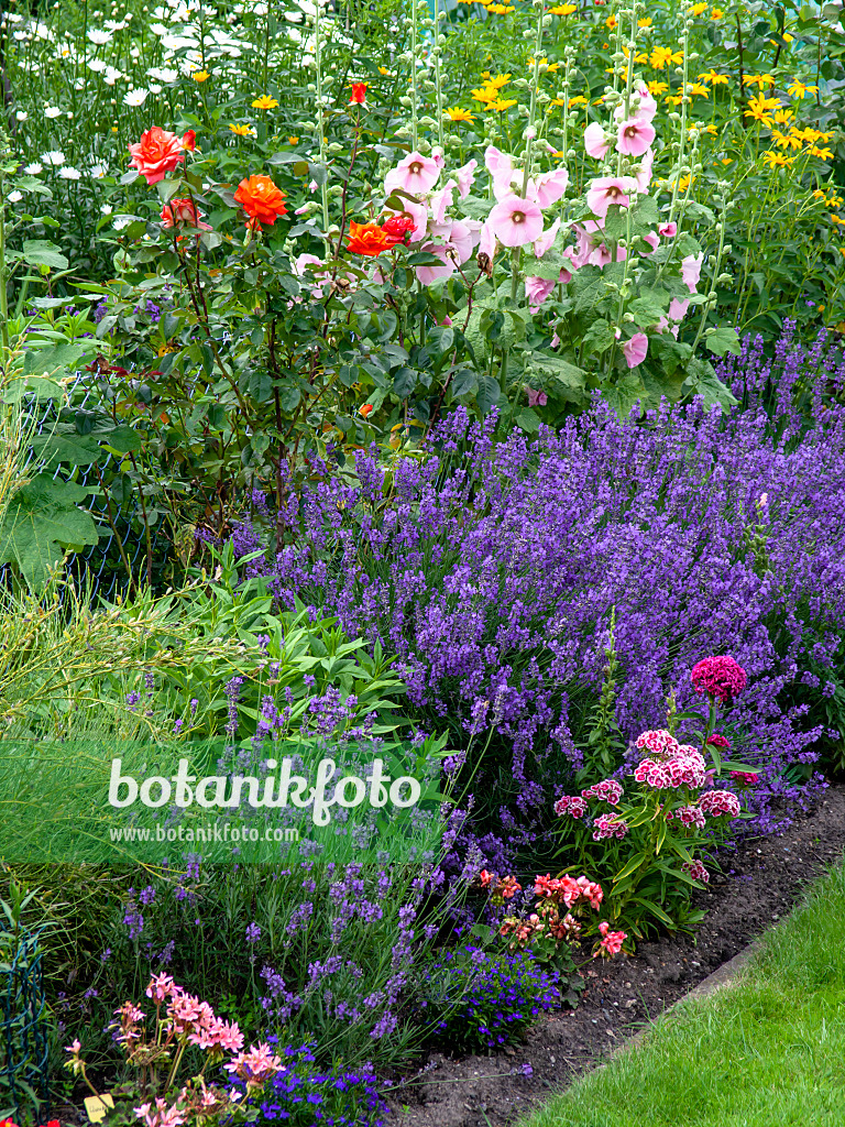 Lavande vrai (Lavandula angustifolia), rosiers (Rosa) et Phlox