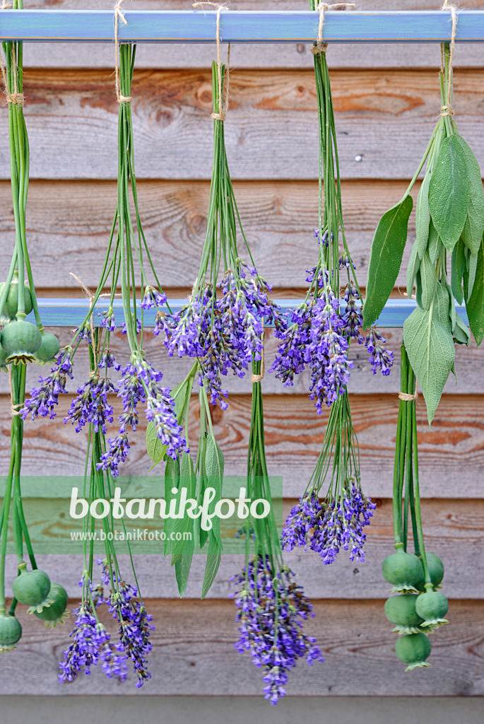 Lavande vrai (Lavandula angustifolia), sauge officinale (Salvia officinalis) et pavot somnifère (Papaver somniferum) accrochés pour sécher