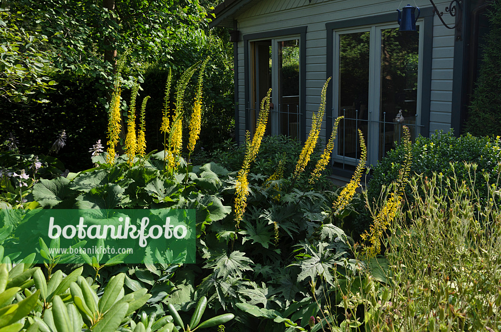 Ligulaires (Ligularia) devant un abri de jardin