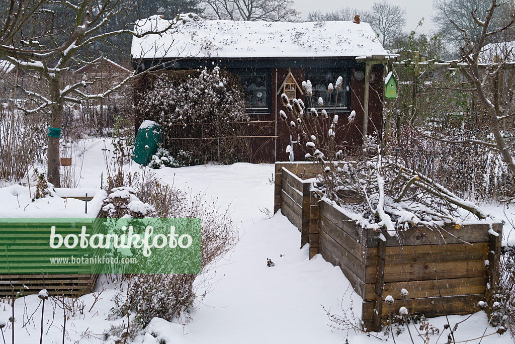 Lits surélevés recouverts de neige devant un abri de jardin dans un jardin familial hivernal