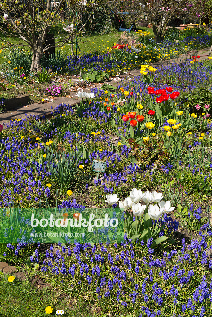 Muscari, tulipes (Tulipa) et pissenlits (Taraxacum)