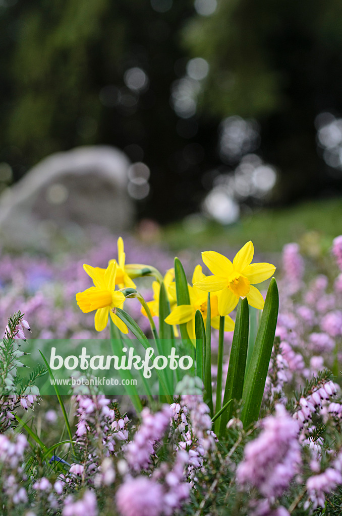 Narcisses (Narcissus) et bruyère des neiges (Erica carnea syn. Erica herbacea)