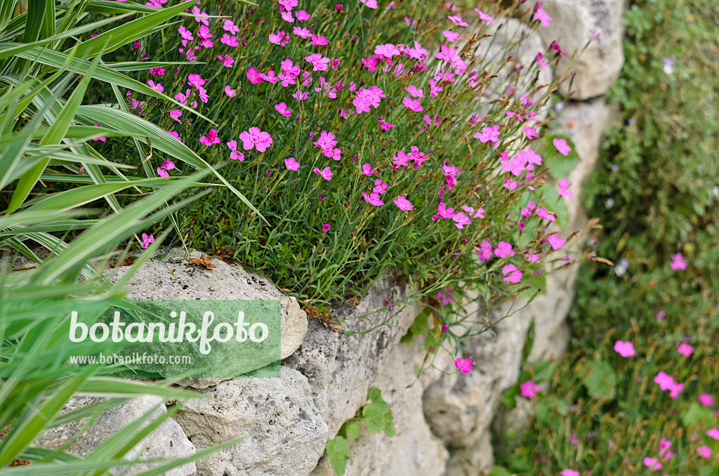 Œillet à delta (Dianthus deltoides) sur un mur de pierres sèches