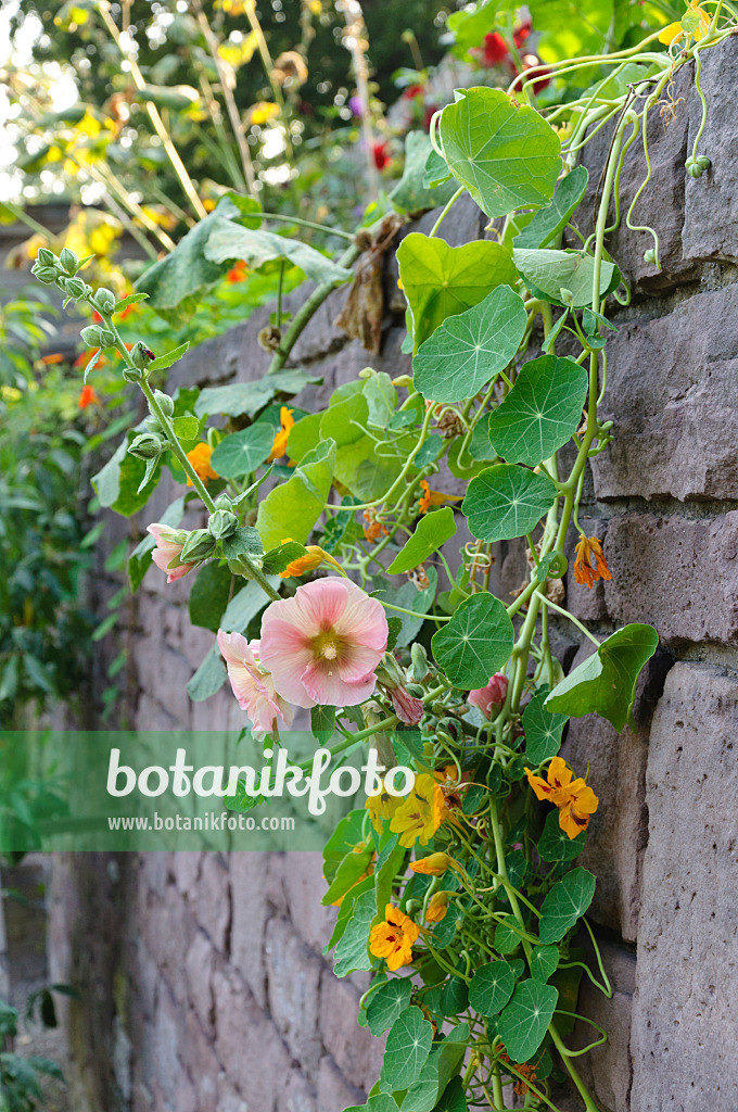Passerose (Alcea rosea) et grande capucine (Tropaeolum majus)