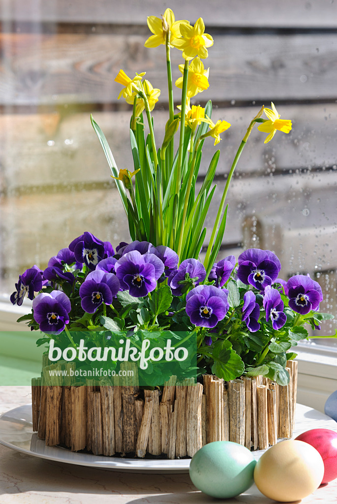 Pensées à corne (Viola cornuta) et narcisses (Narcissus)