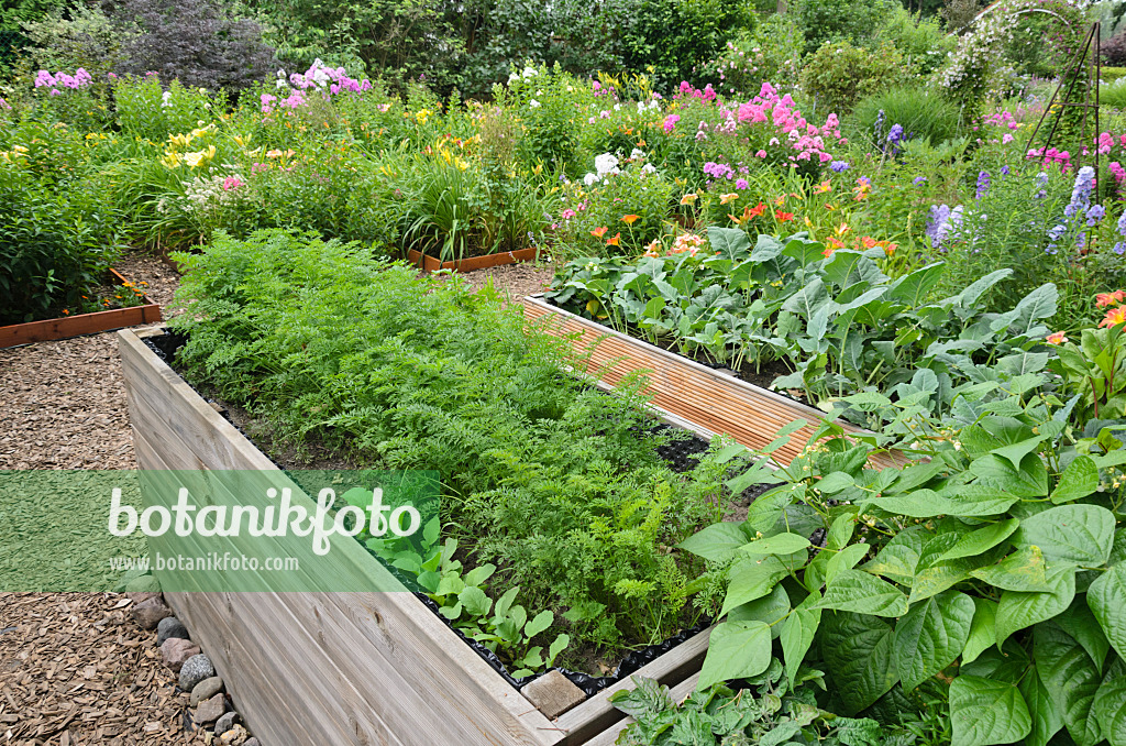 Persils cultivés (Petroselinum crispum), haricots communs (Phaseolus vulgaris var. nanus) et choux-raves (Brassica oleracea var. gongyloides) dans des potagers surélevés