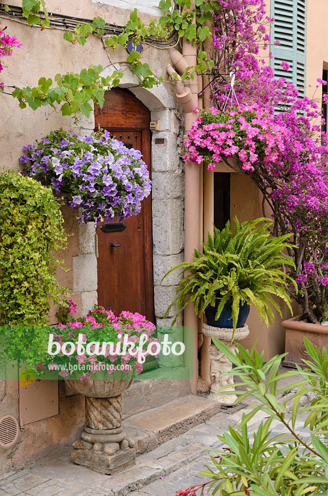 Pétunias (Petunia) et bougainvillée (Bougainvillea) devant une maison de la vieille ville, Cannes, France
