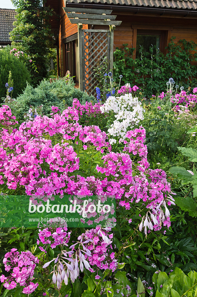 Phlox paniculé (Phlox paniculata) devant un abri de jardin