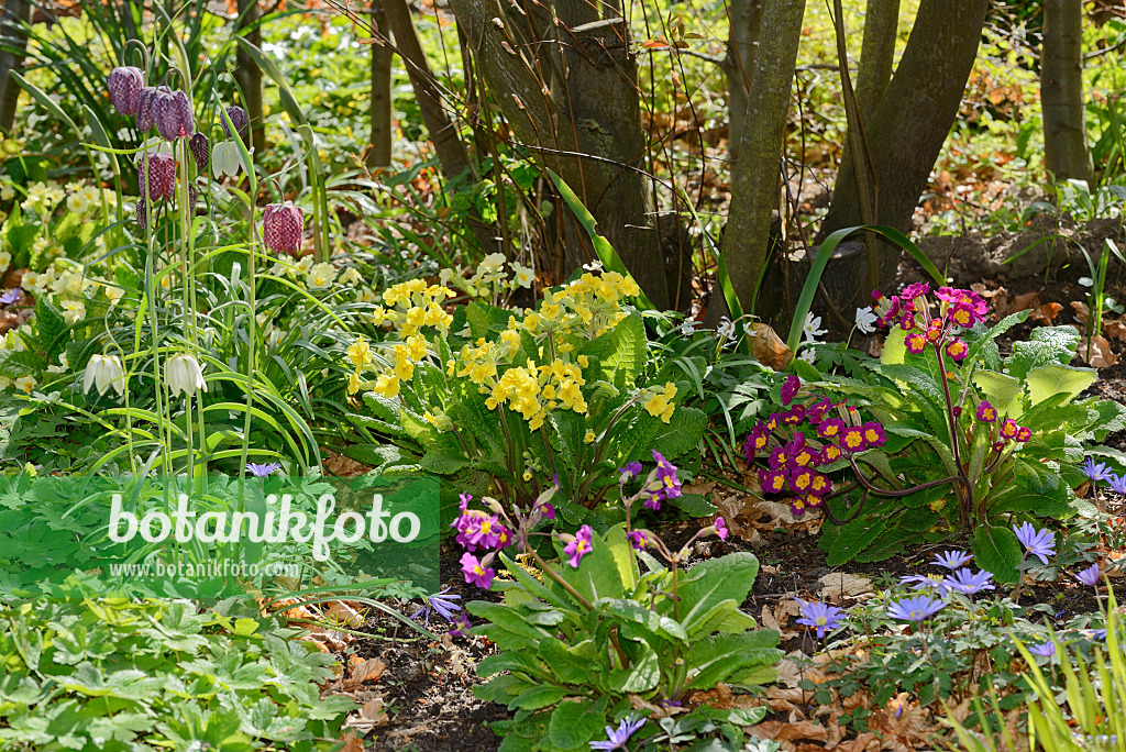 Primevères (Primula), fritillaire pintade (Fritillaria meleagris) et anémone de mars des Balkans (Anemone blanda)