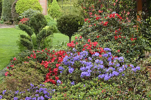 Rhododendrons (Rhododendron) et thuya occidental (Thuja occidentalis) en forme de spirale