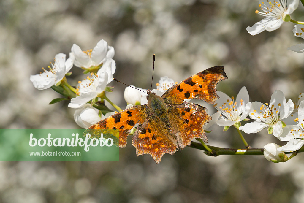 Robert-le-Diable (Polygonia c-album syn. Nymphalis c-album) et mirabelle (Prunus domestica subsp. syriaca)