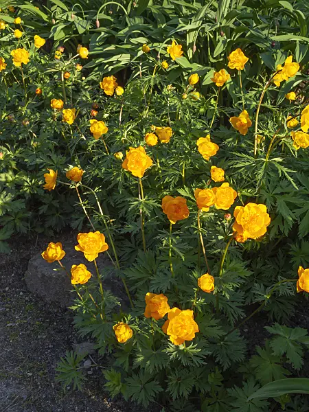 Rodgersia pinnata, trolle de Chine (Trollius chinensis) et funkias (Hosta)