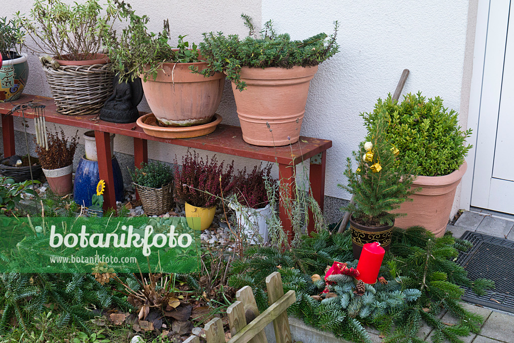 Rosiers (Rosa) avec protection hivernale et plantes en bacs dans un jardin de devant