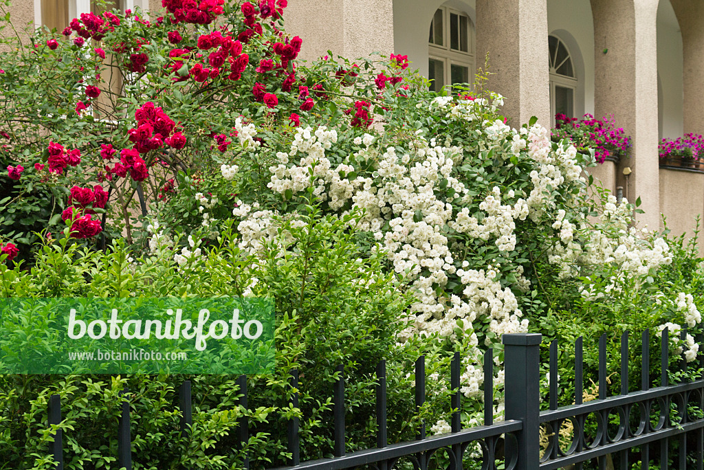 Rosiers (Rosa) dans un jardin de devant d'un immeuble collectif