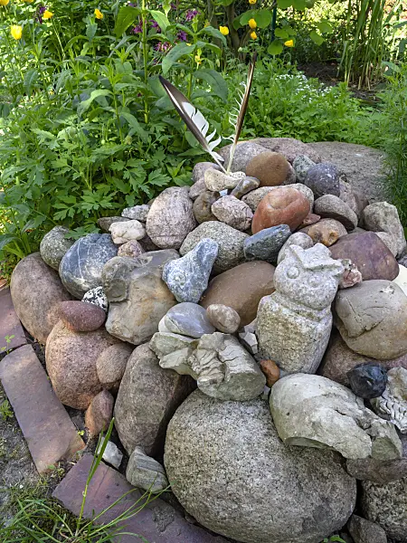 Sculpture d'un gnome ou d'une gargouille en pierre sur un piquet en bois dans un jardin
