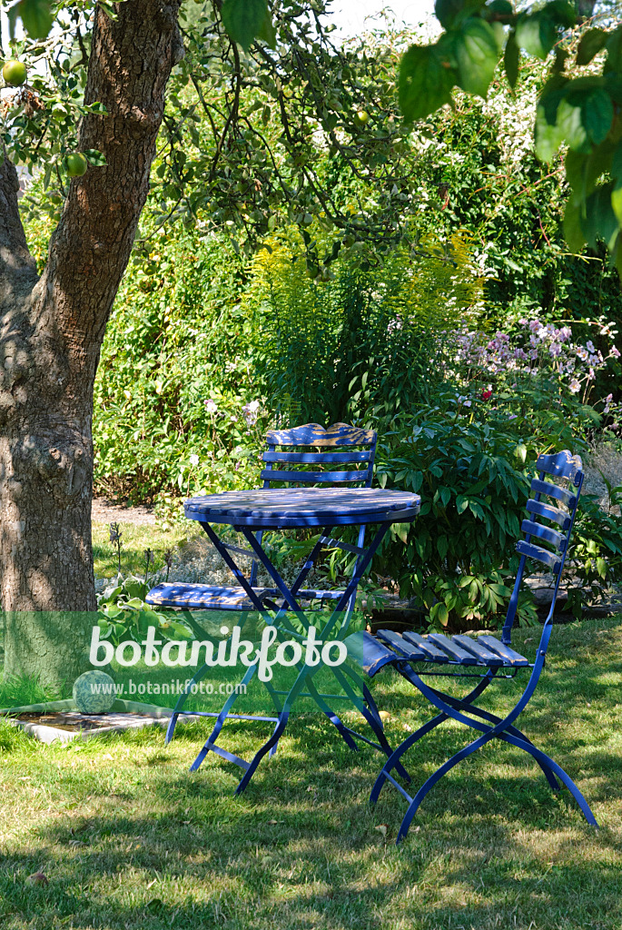 Table de jardin bleue avec deux chaises pliantes sous un pommier
