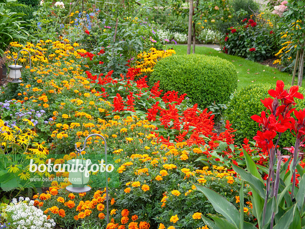 Tagètes (Tagetes), sauge écarlate (Salvia splendens) et buis commun (Buxus sempervirens)