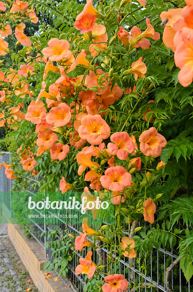 Campsis radicans, aussi appelé bignone ou trompette de Virginie, est une plante grimpante vivace originaire d'Amérique du Nord. Elle produit des fleurs en forme de trompette, généralement orange ou rouge, qui attirent les colibris. Rustique et vigoureuse, elle s'accroche aux supports grâce à ses racines aériennes. Elle préfère le plein soleil et un sol bien drainé. Attention, sa sève peut irriter la peau.