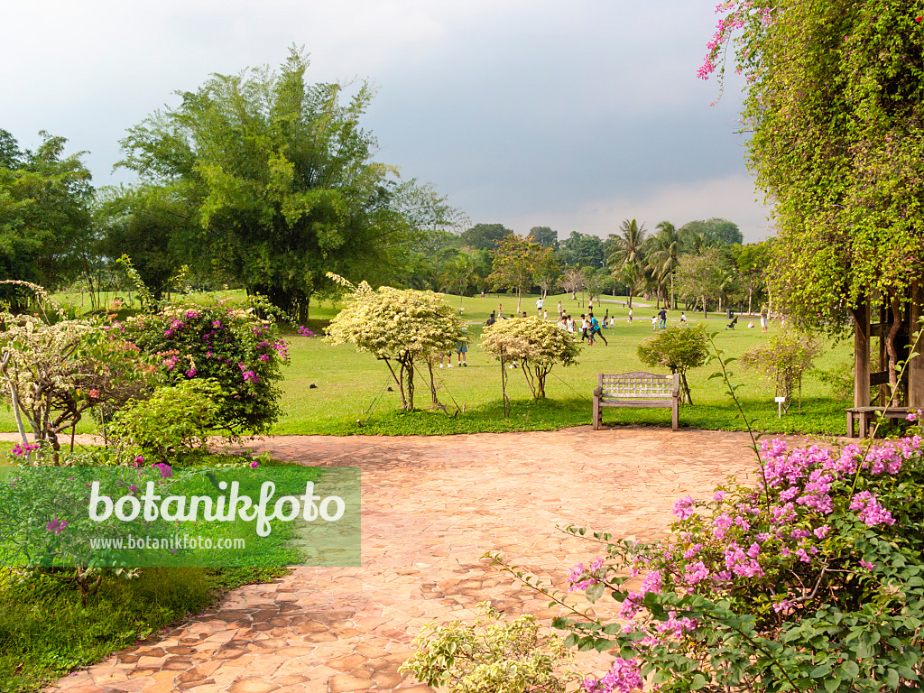 Un parc tropical spacieux avec un ciel pluvieux