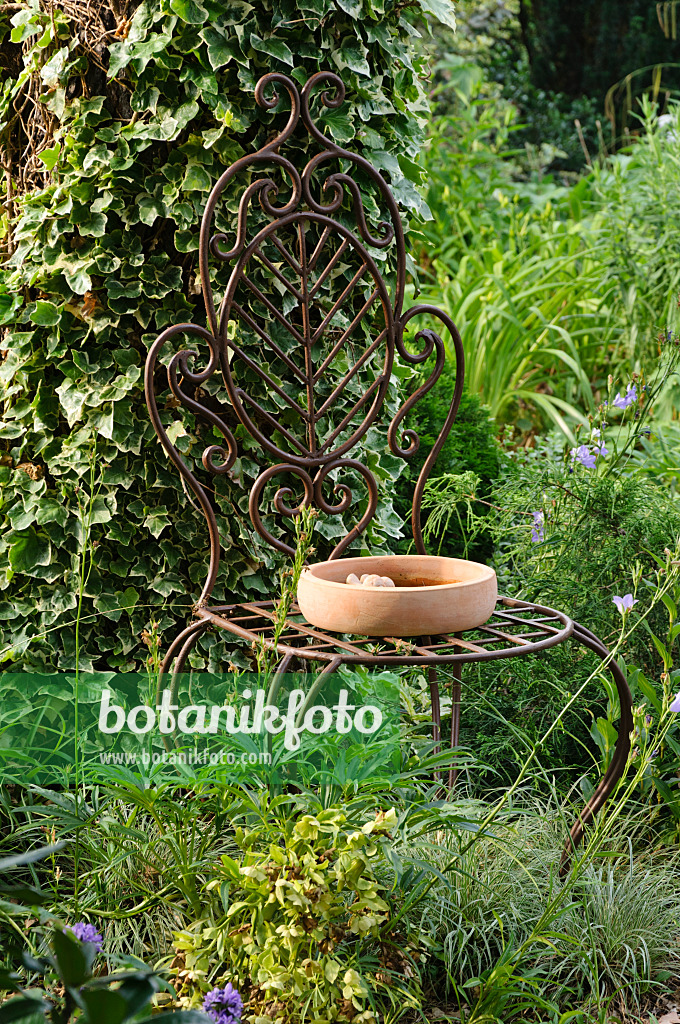 Vieille chaise courbée avec rocailles en fonte avec un bain d'oiseaux rond en argile dans un jardin