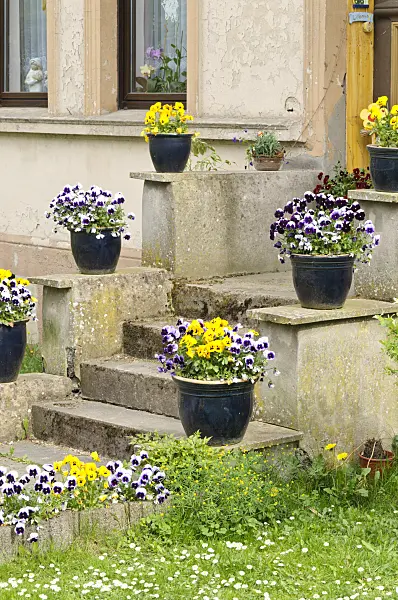 Violette multicaule (Viola x wittrockiana) dans un bac en bois