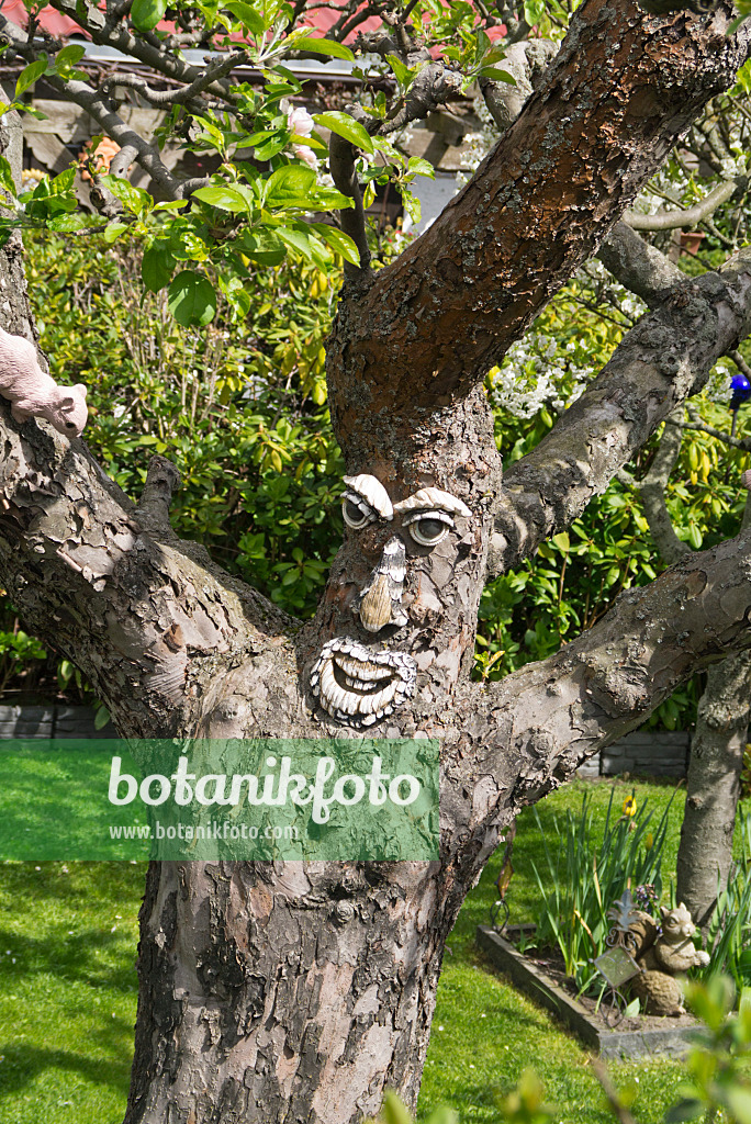 Visage sur le tronc noueux d'un pommier dans un jardin familial