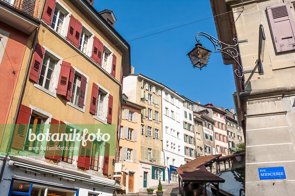 Volets rouges et beiges sur des maisons anciennes dans une rue montante de la vieille ville, Lausanne, Suisse