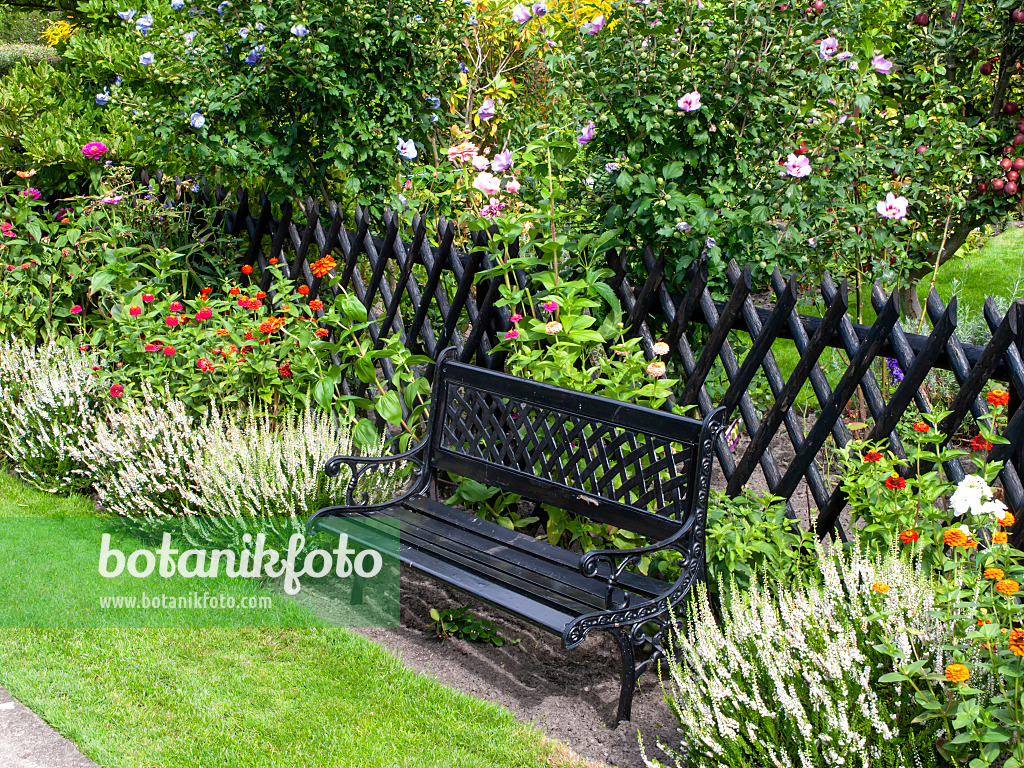 Zinnias (Zinnia), bruyères (Calluna) et Hibiscus à côté d'un banc de jardin