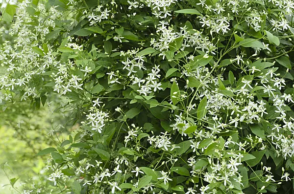 Clématite dressée (Clematis recta) et campanules (Campanula)