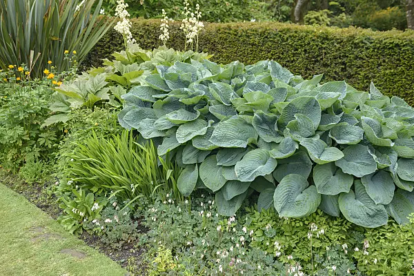 Ail géant (Allium Globemaster), funkia (Hosta sieboldiana 'Elegans') et alchémille (Alchemilla)