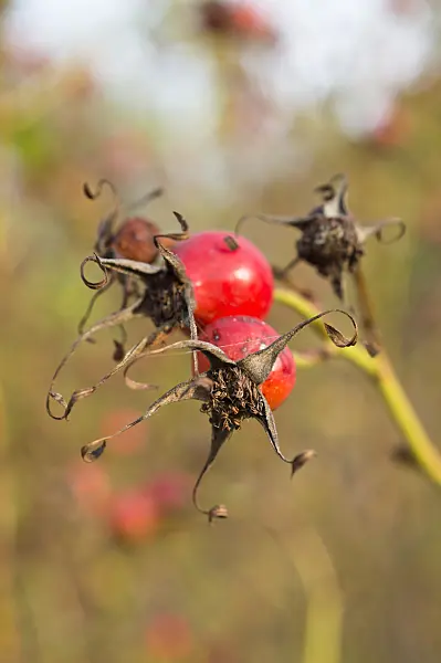 Impression colorée avec des cynorhodons et des feuilles ensoleillées