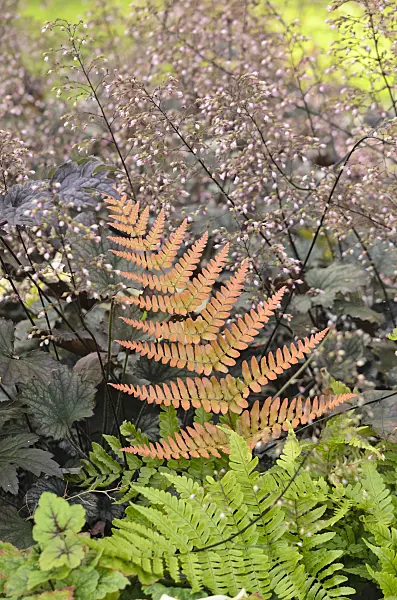 Fougère à indusies rouges (Dryopteris erythrosora) et heuchère (Heuchera villosa 'Frosted Violet')