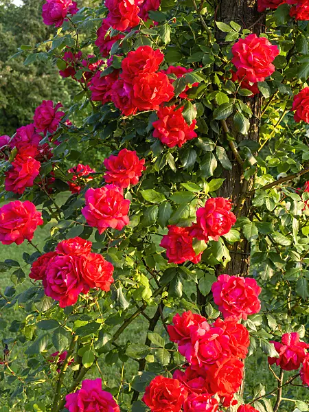 Rosier grimpant (Rosa Mistress F.W. Flight) et rosier multiflore (Rosa Paul's Scarlet Climber)