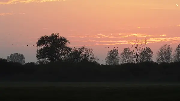 Grues cendrées (Grus grus) dans le ciel de soirée, parc national de la vallée de la Basse-Oder, Allemagne